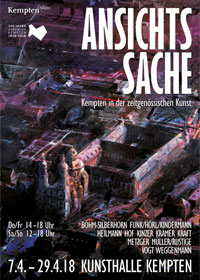 Ansichtssache. Kempten in der zeitgenössischen Kunst Vernissage: Fr. 6.4.18, 19 Uhr Laufzeit: 7. - 29.4.18, Do/Fr 14-18 Uhr, Sa/So 12-18 Uhr Kuratorenführung: 22.4.18, 15 Uhr Nachgefragt – Kunst im Dialog: Sonntag, 29.4.18, 16 Uhr Finissage: Sonntag, 29.4.18, 17 Uhr Mit Angelika Böhm-Silberhorn, Funk/Hörl/Kindermann, Horst Heilmann, Christian Hof (Kurator), Pit Kinzer, Susanne Krämer, Justus Kraft, Reiner Metzger, Müller/Rustige, Alexandra Vogt, Guido Weggenmann |