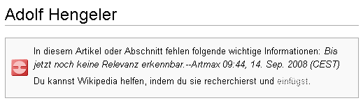 Datenaufbereitung[25.09.08] Idee: Datenaufbereitung [digital] [11.12.08] 1. Überarbeitung [12.01.09] 2. Überarbeitung [30.01.09] Wikipedia Freigabe Aktion: Vervollständigung des Wikipedia-Eintrags zu "Adolf Hengeler" anhand beim Kulturamt Kempten angeforderter Daten ![]() |