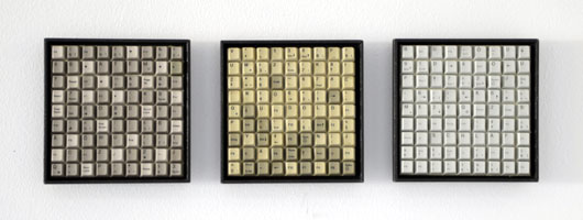 Wird es aus dem Alphabet entfernt, kann mit dem Rest noch immer das Wort "VOLK" gebildet werden. Und auch ohne "VOLK" bietet der Buchstabenrest am Ende sogar das kleine Wort "WIR" ... In aktuell 29 Tastenmontagen, die lediglich 20 x 20 cm groß sind, bilden der Titel, die Farbanmutung einer einzelnen gebrauchten Tastatur und ein im Bild zurückgebliebenes Wort ein absolut reduziertes Sprachmuster: Der FRÜHLING spricht vom ATEM, der HERBST vom GOLD, der WINTER vom SCHLAF, die GLUT von der ASCHE ...