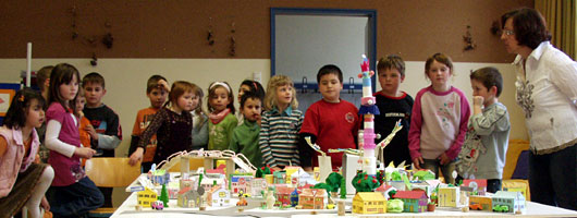 Projekt : HappytownEin Vormittag und zwei Nachmittage haben ausgereicht, um zusammen mit zwanzig Schülern der Klasse 1c der Haubenschloßschule Kempten im Rahmen der jahresbegleitenden Aktion "Künstler und Kunst an der Schule" eine ganze Stadt zu basteln. Im Vordergrund stand dabei, mit einem so großen Projekt den Kindern das gute Gefühl des gemeinsamen Erfolges nahezubringen. Die gemeinsame Entwicklung der umgesetzten Ideen und das Basteln der vielfältigen Gebäude für die Gemeinschaft ist für alle beteiligten Eltern, Lehrern, Kinder ein tolles Erlebnis gewesen. ![]() |