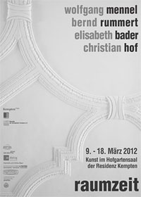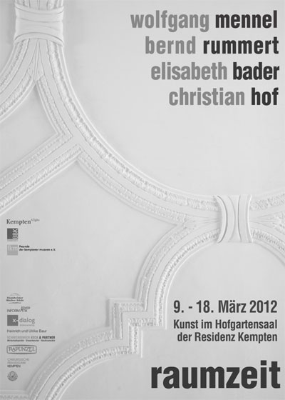 raumzeit | 09.03. - 18.03.2012 Wolfgang Mennel Bernd Rummert Elisabeth Bader Christian Hof Kunst im Hofgartensaal der Residenz Kempten Residenzplatz 4-6 87435 Kempten Eröffnung: 09.03.2012 19 Uhr Begrüßung: Dr. Ulrich Netzer Oberbürgermeister der Stadt Kempten Einführung: John Patrick Kohl ![]() ![]() |