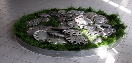 Auf der Suche nach der Liebe des LebensGerade in der nasskalten Herbstzeit begegnen uns am Rande von kargen Landstraßen oder im kalten Neonlicht der Laternen manchmal verlorene Radkappen, die wie zurückgelassen im verlaubten Gras oder am Bordstein liegen. Von zufälligen Passanten gut sichtbar aufgestellt, warten nicht wenige in stillem Harren darauf, trotz ihrer Schrammen und inneren Brüche zu ihrem angestammten Platz im Verkehr des Lebens zurückzukehren. Und obwohl ihnen unzählige Räder begegnen, deren Verlust einen Blick in die dunkle Leere ihrer Seele offenbaren, findet sich nur ganz selten ein Gegenstück, das im richtigen Augenblick innehält, Kontakt aufnimmt und dann auch noch das passende Modell ist. "Auf der Suche nach der Liebe des Lebens" 2007 [07-09] Installation 34 Radkappen - im Nov/Dez 06 im Raum Kempten gefunden - auf Rollrasen; in den Räumen des AÜW vom 20.06. - 01.07.07 installiert |