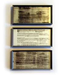 ![]() TransportraitsTransportraits: offene Briefgeheimnisse #1 - #27 präsentiert offizielle Schreiben, die dem Künstler innerhalb eines halben Jahres zugestellt worden sind. Verschiedene Rechnungen, Kontoauszüge, Verträge, die Einkommensteuererklärung, Kirchensteuerbescheid, Wahlunterlagen zum Bürgerentscheid und sogar eine Verwarnung wegen überhöhter Geschwindigkeit werden durch transparente Überlagerung im Briefformat zum Röntgenblick in die Privatsphäre des Künstlers. [...] Auch in "Transportraits – offene Briefgeheimnisse" spielt Hof mit dem Voyeurismus. Ob Heizkostenabrechnung, Kfz-Reparaturrechnung, Stimmzettel für Bürgerbegehren, Wertpapierdepot oder die Ablehnung der Bewerbung für die Kunstausstellung der Allgäuer Festwoche 2007 – der Kemptener hat persönliche Briefe auf transparente Folien kopiert, die wichtigsten Teile davon übereinandergelagert in gleichformatige Rahmen eingepasst. [...] [22.08.08, Michael Dumler, AZ] |