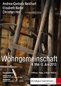 Wohngemeinschaft 04.05. - 02.06.2013 Andrea-Corinna Neidhart Elisabeth Bader Christian Hof Kornhaus Weiler Hauptstr. 13 88171 Weiler-Simmerberg Eröffnung: 03.05.2013 19:30 Uhr Einführung: Dr. Sylvia Heudecker |